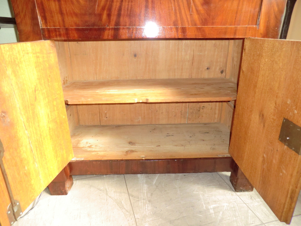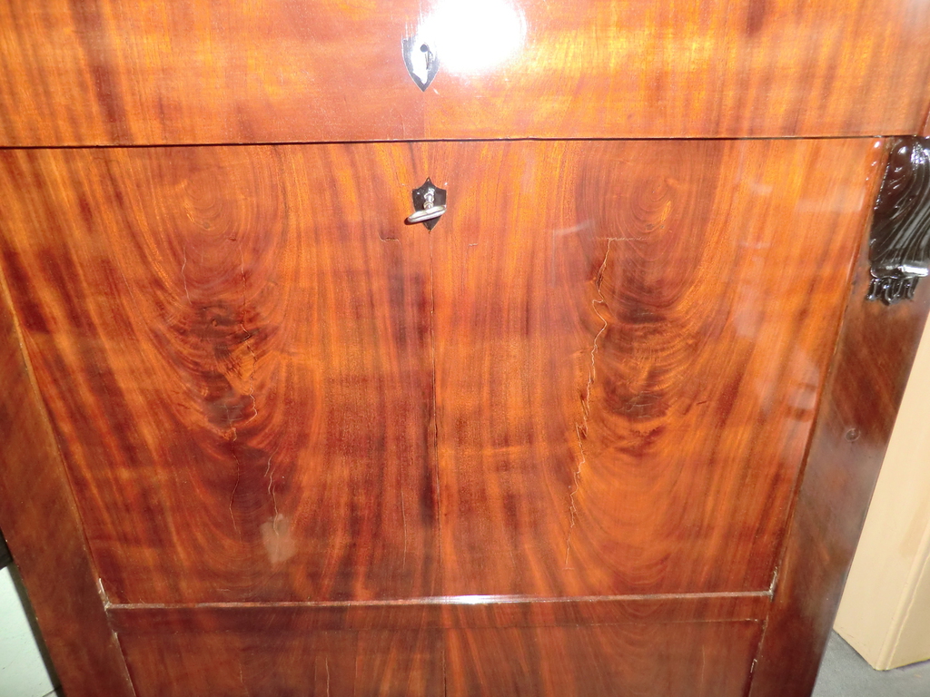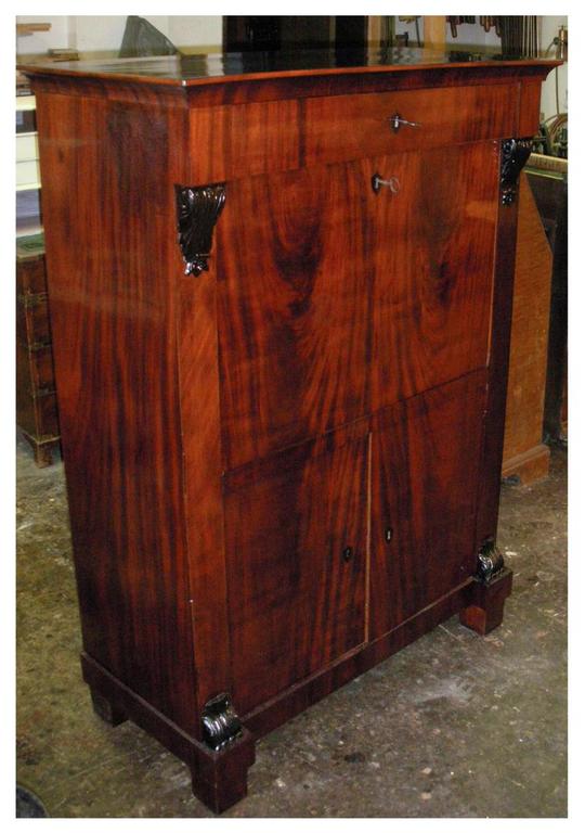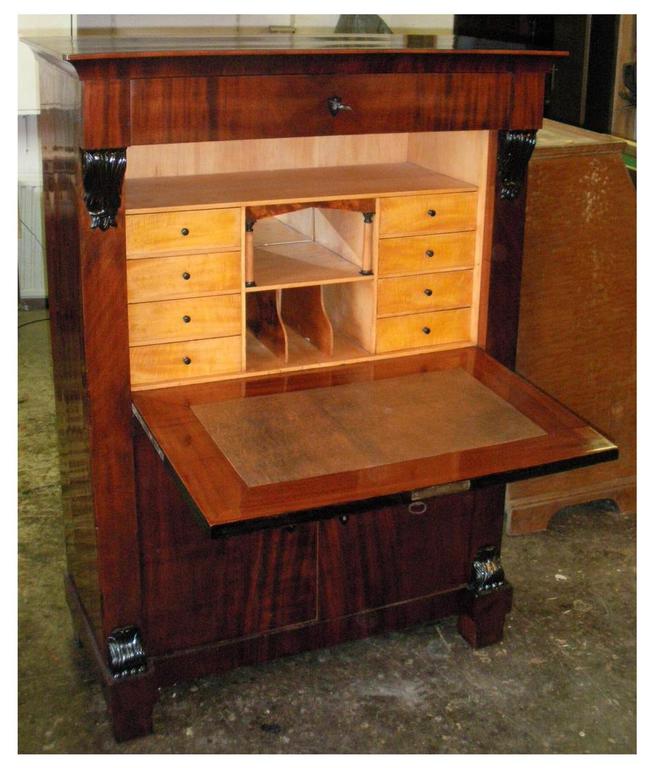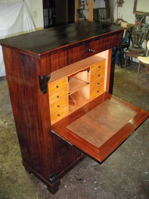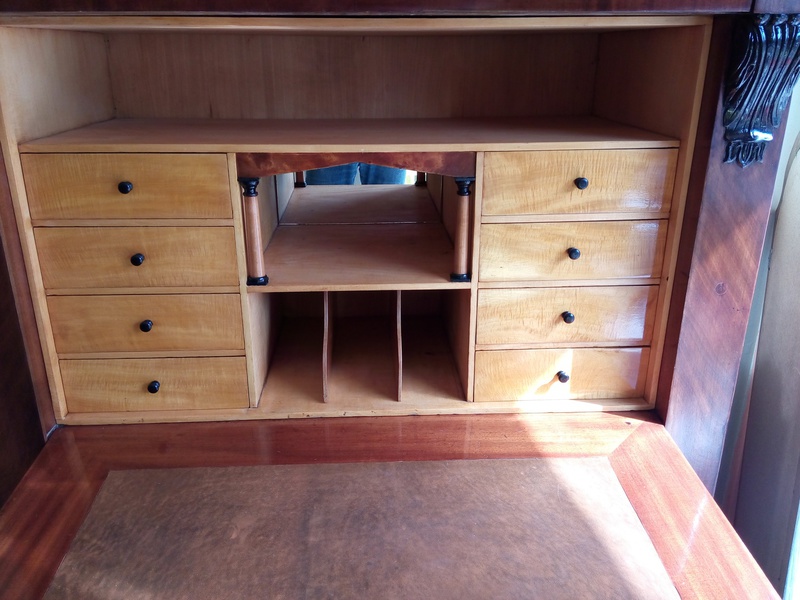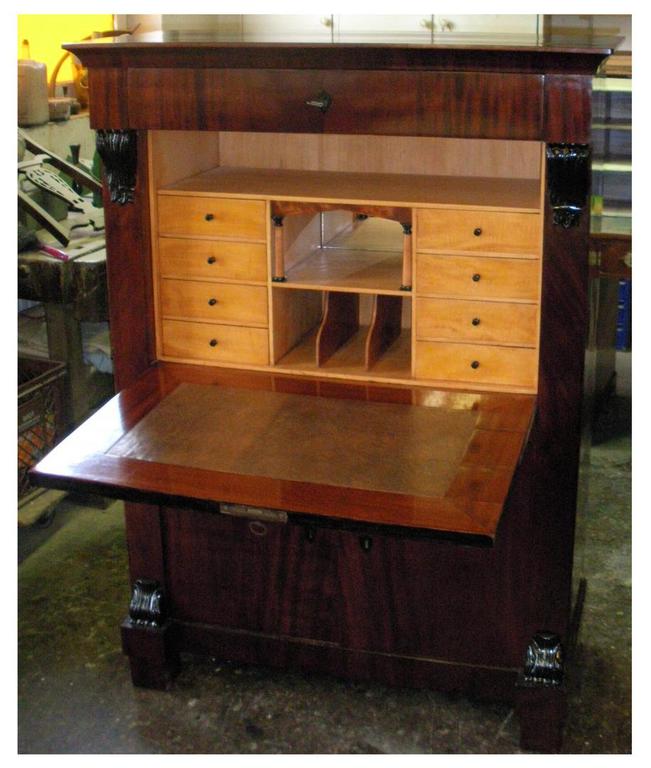 Mahagoni- und Pyramidenmahagoni-Furnier auf Eiche, Valuten und Deckplatte ebonisiert, Innenleben in Ahorn. Über dem Brieffach 2 vollplastische Säulen, vor der Rückwand ein Spiegel. Originale funktionsfähige Schlösser und Beschläge. Unter der Schreibplatte 2 Türen, ideale Höhe für Aktenordner.